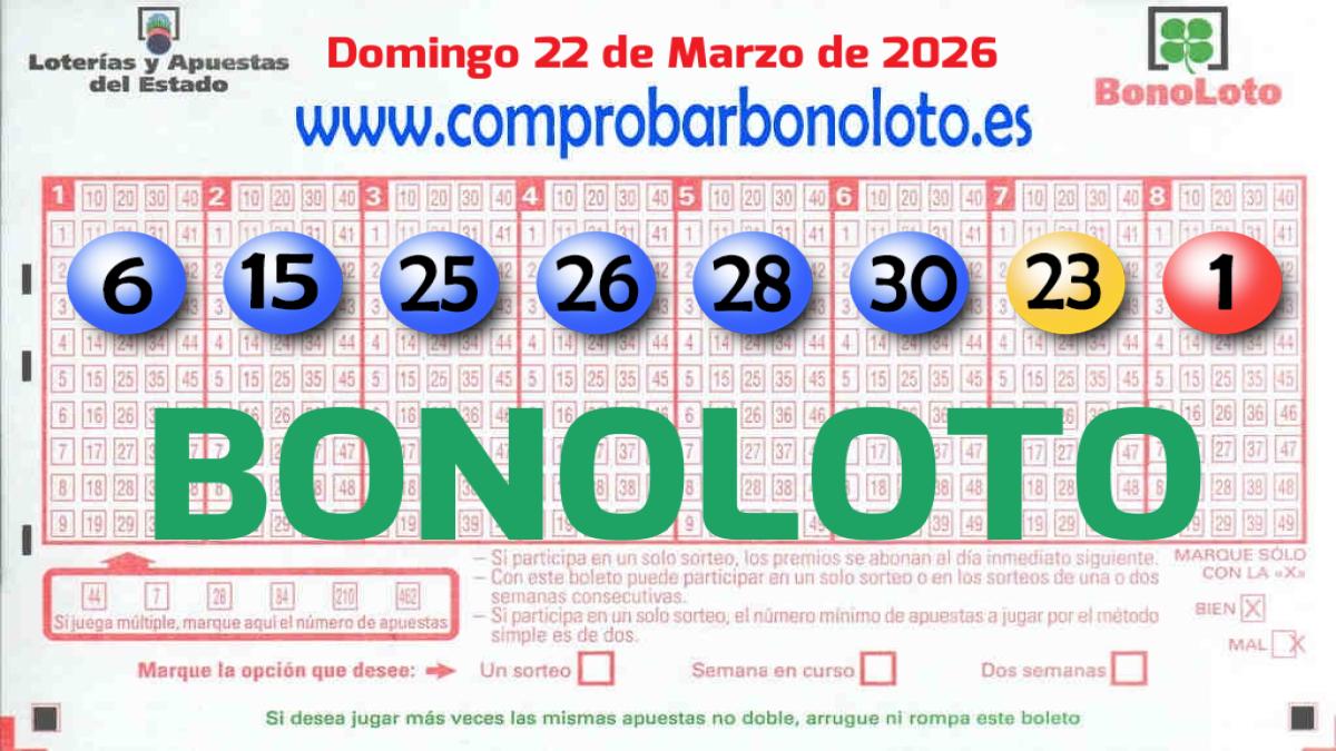 El sorteo de La Bonoloto celebrado el Domingo 22 de Marzo de 2026 ha dejado la suerte en la localidad de Torrent. El punto de venta que lo ha hecho posible está situado en la calle Padre MÃndez, 59 de esta localidad.Desde aquí también queremos felicitar a los ganadores de este premio que ofrece Loterías y Apuestas del Estado.Aprovechamos para recordarte que puedes comprobar La Bonoloto desde esta página, te indicaremos la categoría y el importe de tus premios de La ...